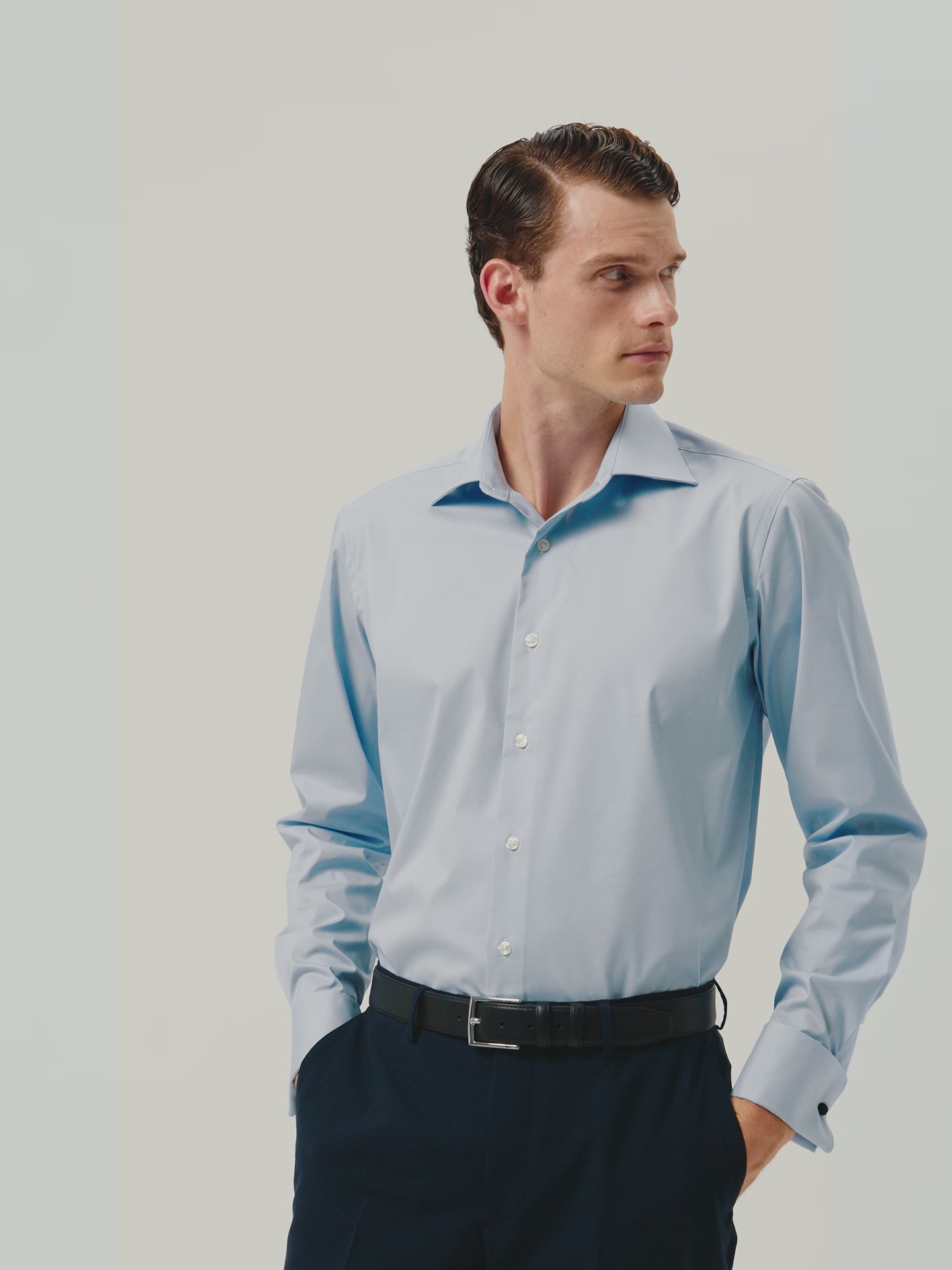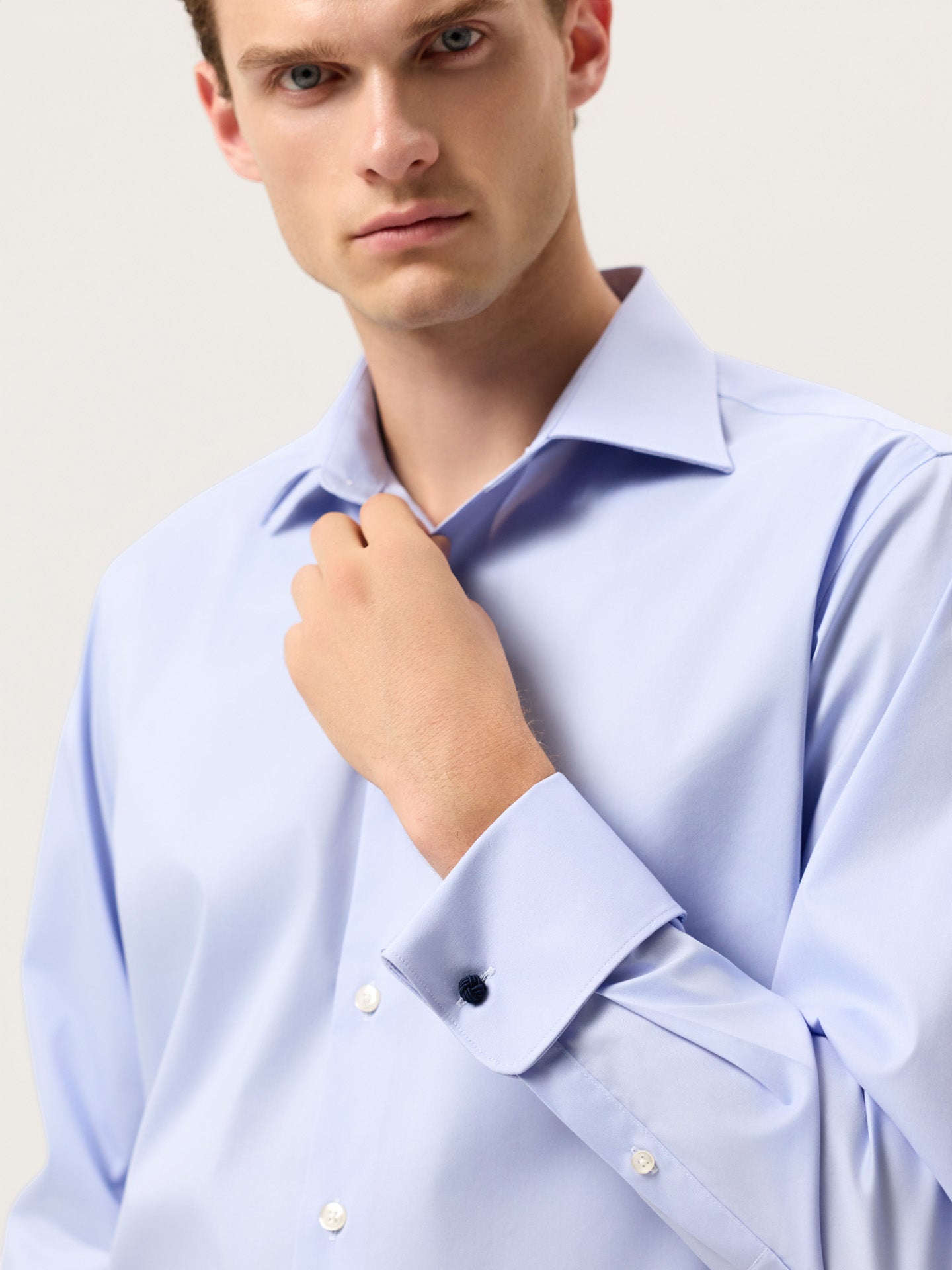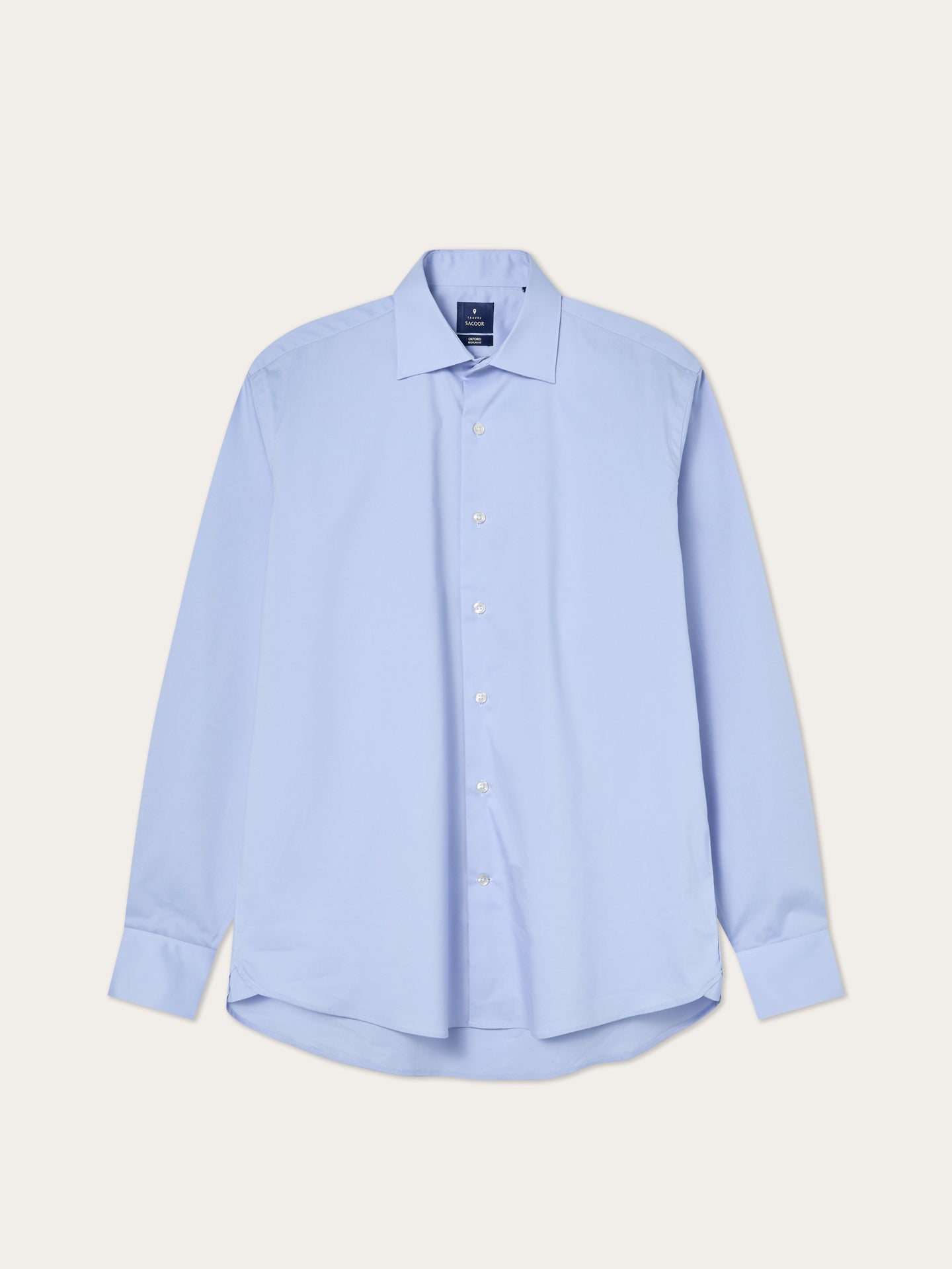 This long-sleeve shirt is cut in a regular fit from a travel-quality poplin blend, offering lightweight comfort and refined structure. It features an Oxford collar, single placket, and double cuffs. The shirt includes a discreet pleat on the sleeve, triangle inserts at the side seams in self-fabric, a horizontal last buttonhole in contrast thread, and off-white buttons. Detailed with removable collar stays, and reinforced construction for durability. This shirt is perfect for office wear and any occasion where a sharp look matters.