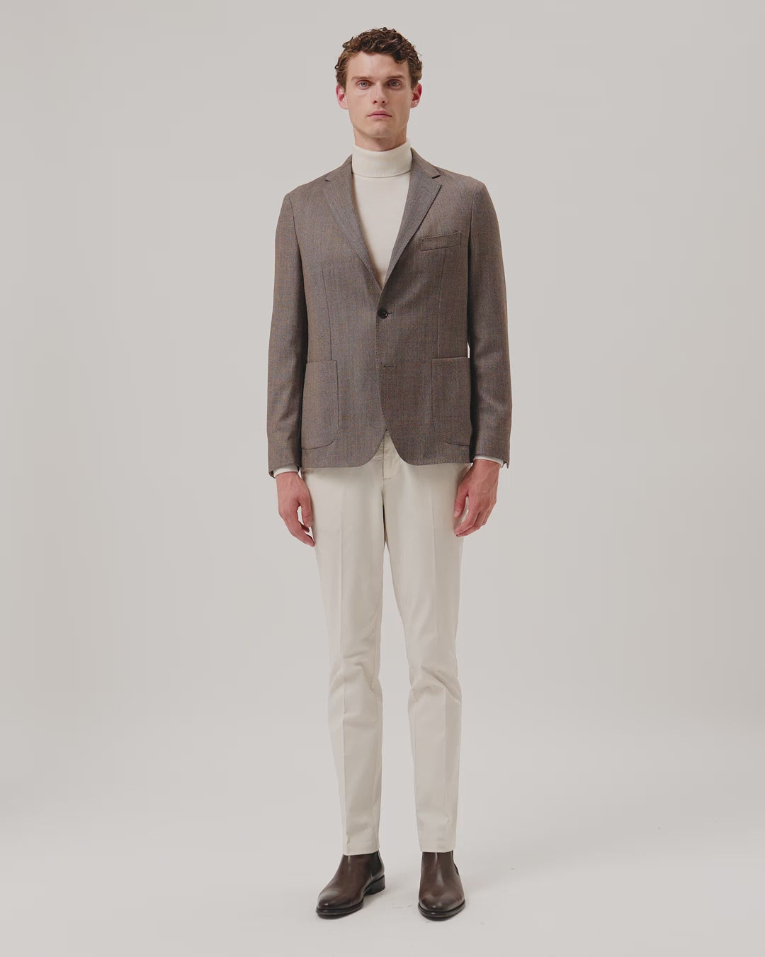 The men's suits from Sacoor Brothers are available with 'Drop 5' and 'Drop 6'. This designation refers to the difference between the blazer size and the trouser size. When ordering a size 46 with 'Drop 5', the trousers will be around size 41, while 'Drop 6' will result in trousers of size 40.
