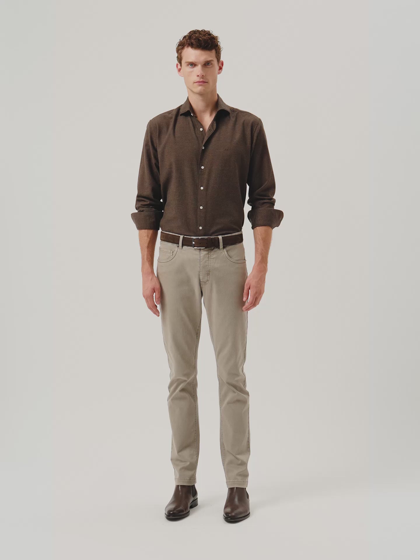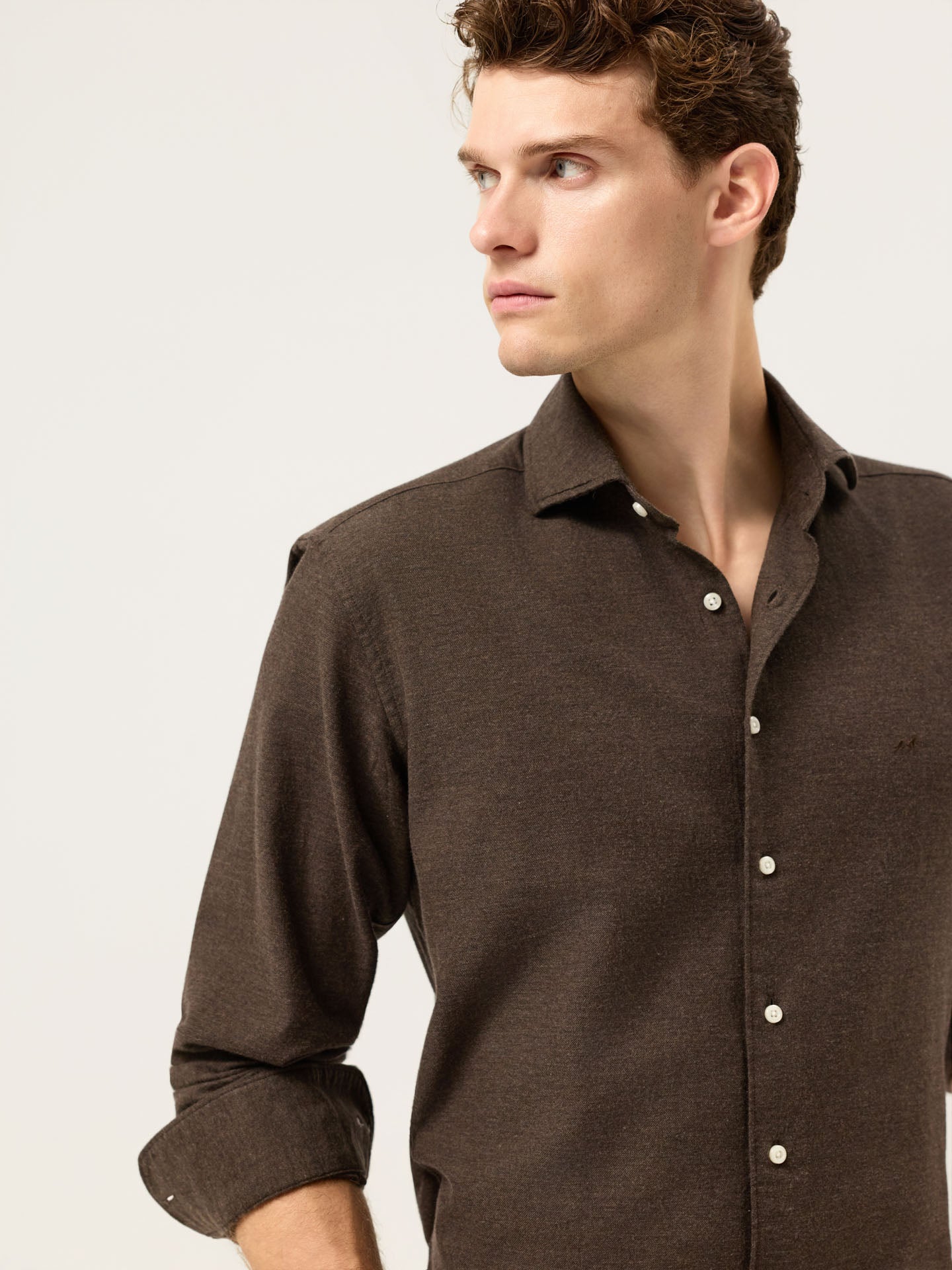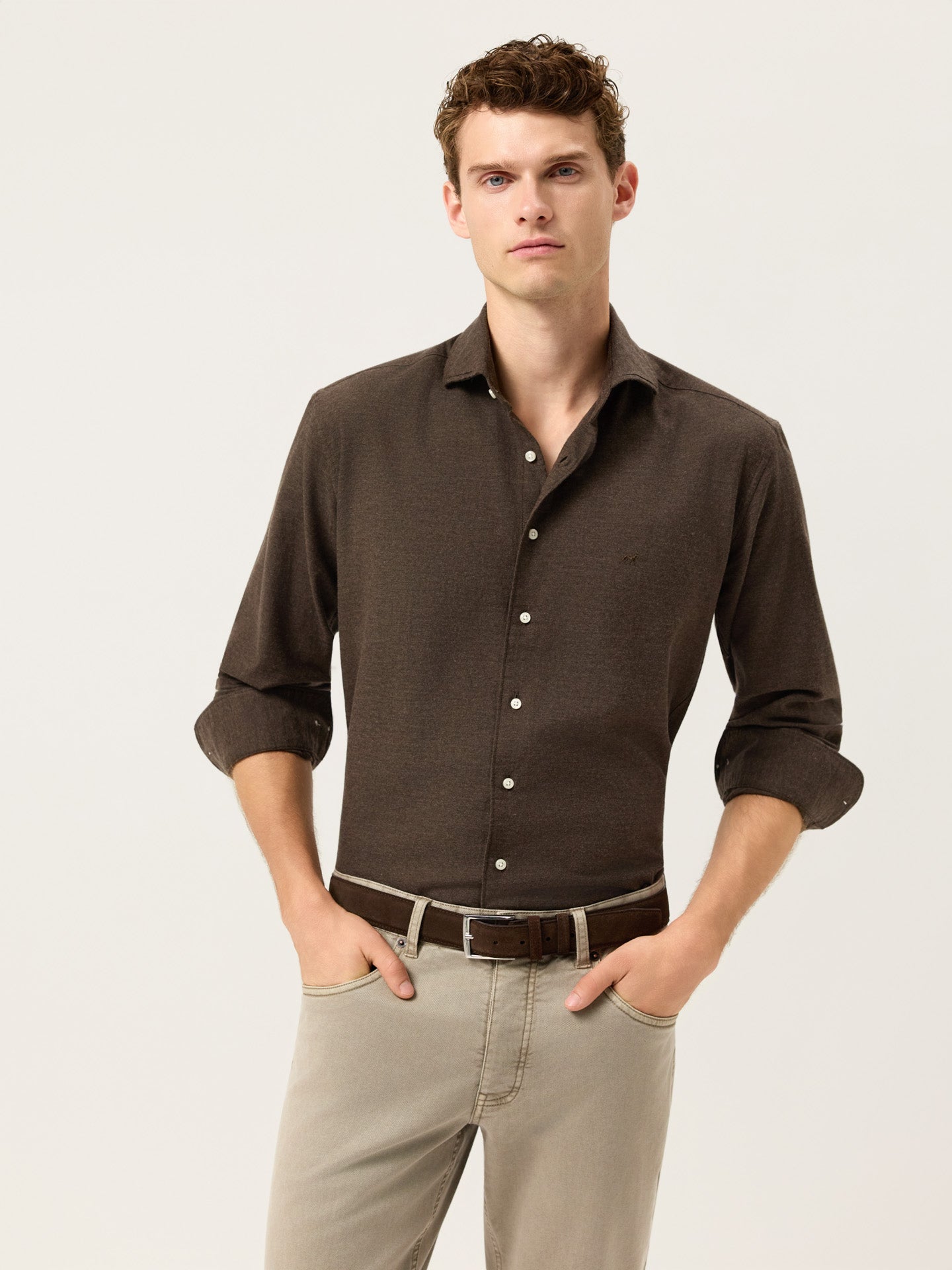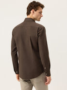 Introducing the Light Flannel Shirt—crafted from 100% cotton in a lightly brushed twill weave, this shirt offers a warm, breathable feel ideal for cooler days. The slim fit ensures a clean silhouette, while the Newport collar and front button-up fastening provide a refined casual look. Long sleeves with single cuffs and two buttons add timeless structure. Finishing touches include a horizontal last buttonhole in matching thread, a triangle side patch in self-fabric, and subtle chest logo embroidery. The shirt also features removable collar stays, and soft off-white buttons. Available in regular fit sizes starting from size XXL. This shirt is a wardrobe essential for those who seek understated sophistication and timeless versatility, seamlessly blending comfort and style for any casual occasion.