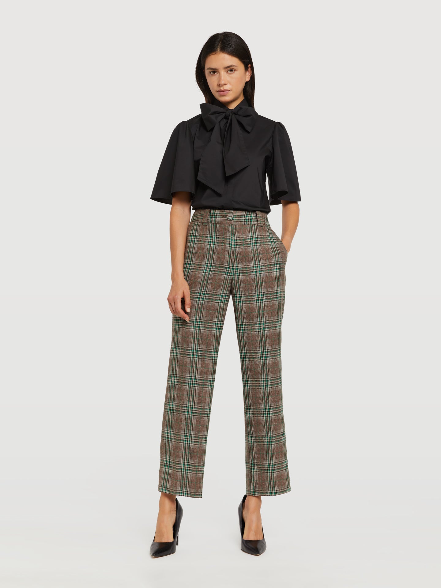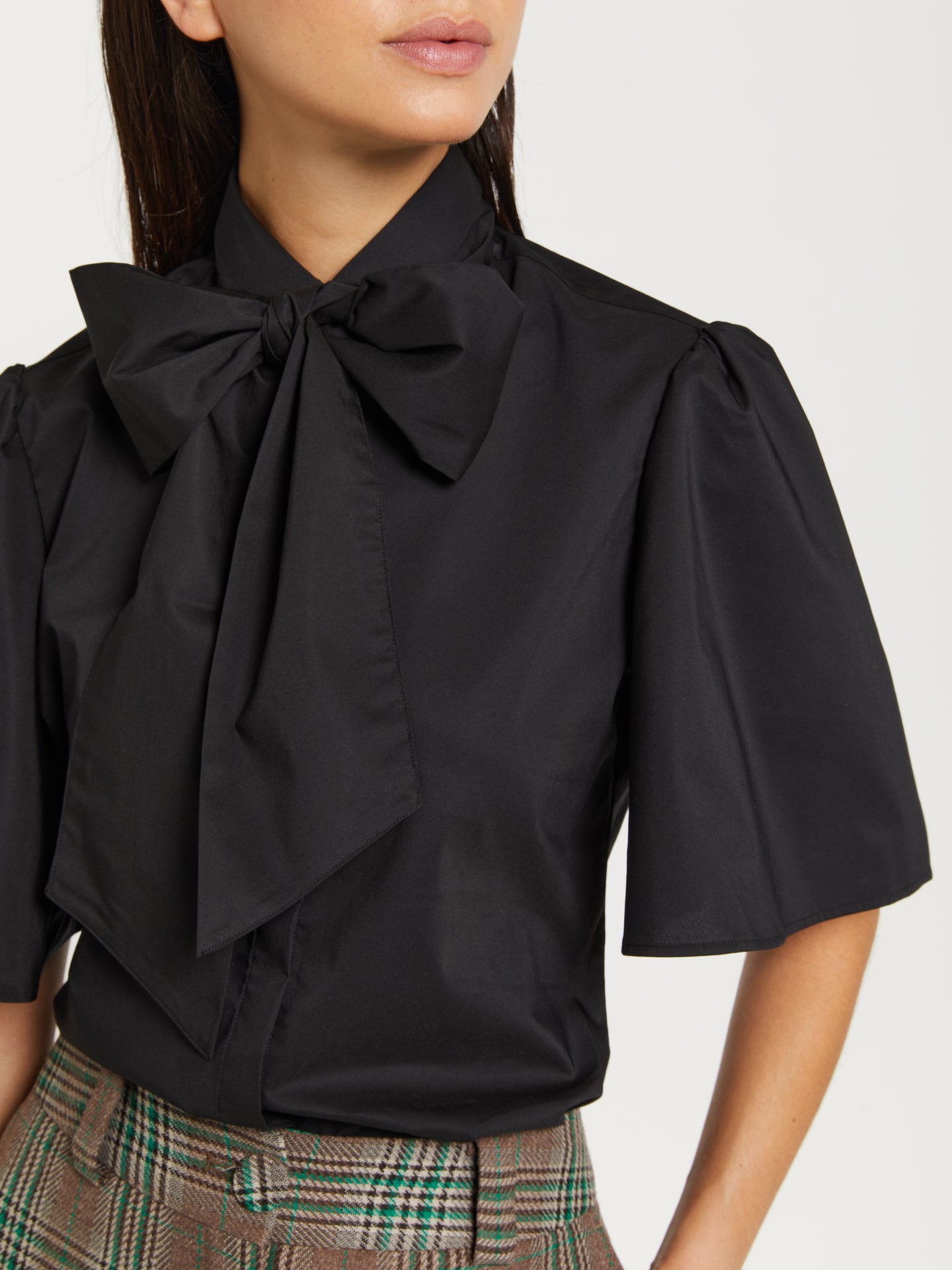 Classic shirt made of high-quality fabric. This regular fit shirt features a collar with big bow detail, hidden placket, voluminous elbow length sleeve and rounded hem. With brand metal plate at the back.