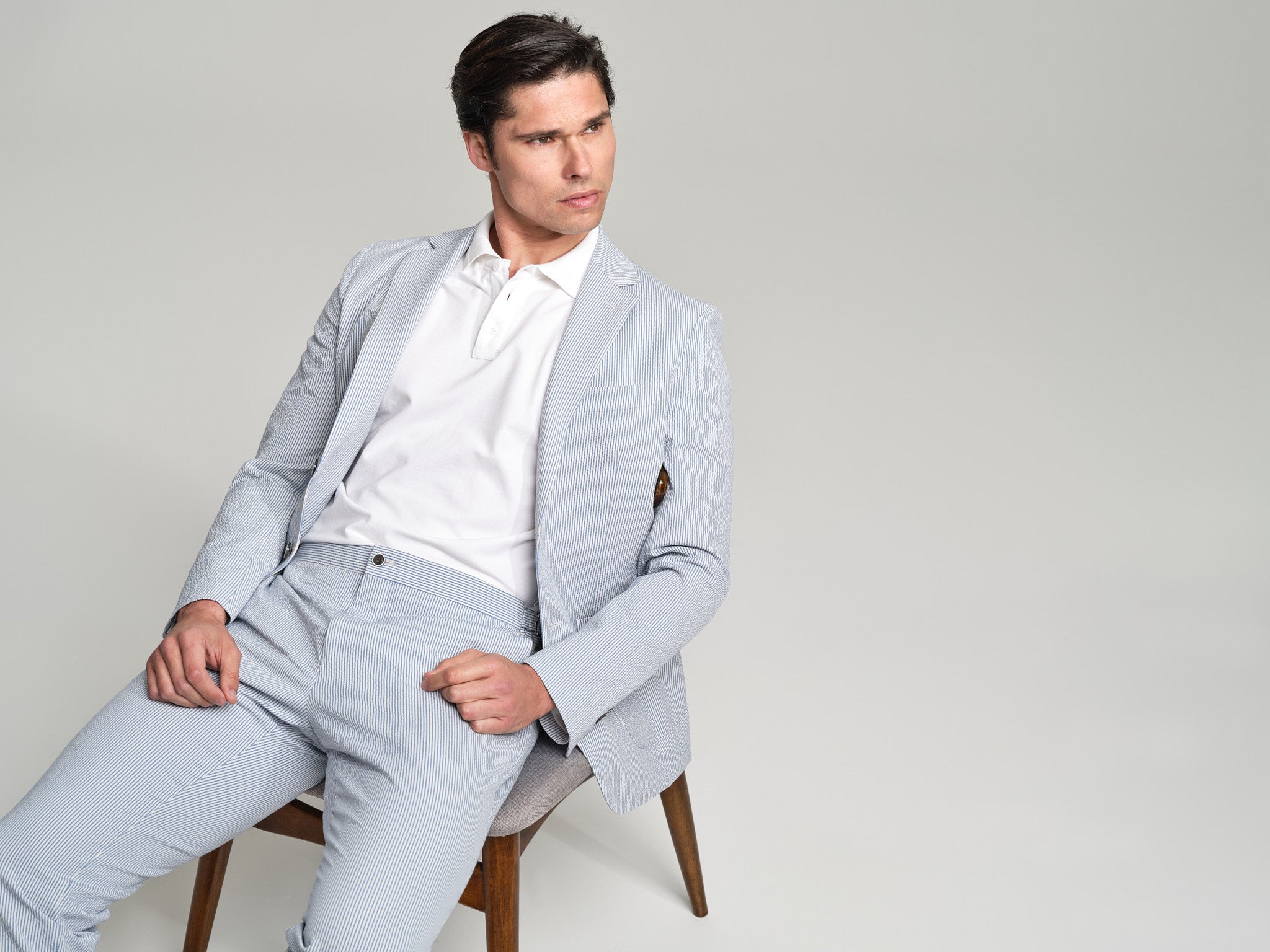 The men's suits from Sacoor Brothers are available with 'Drop 5' and 'Drop 6'. This designation refers to the difference between the blazer size and the trouser size. When ordering a size 46 with 'Drop 5', the trousers will be around size 41, while 'Drop 6' will result in trousers of size 40.