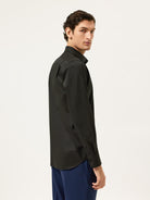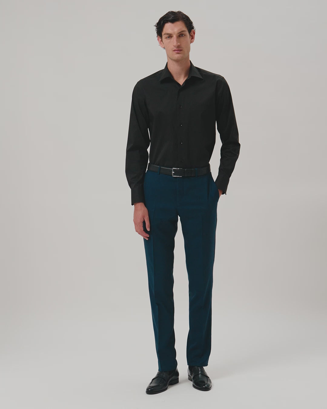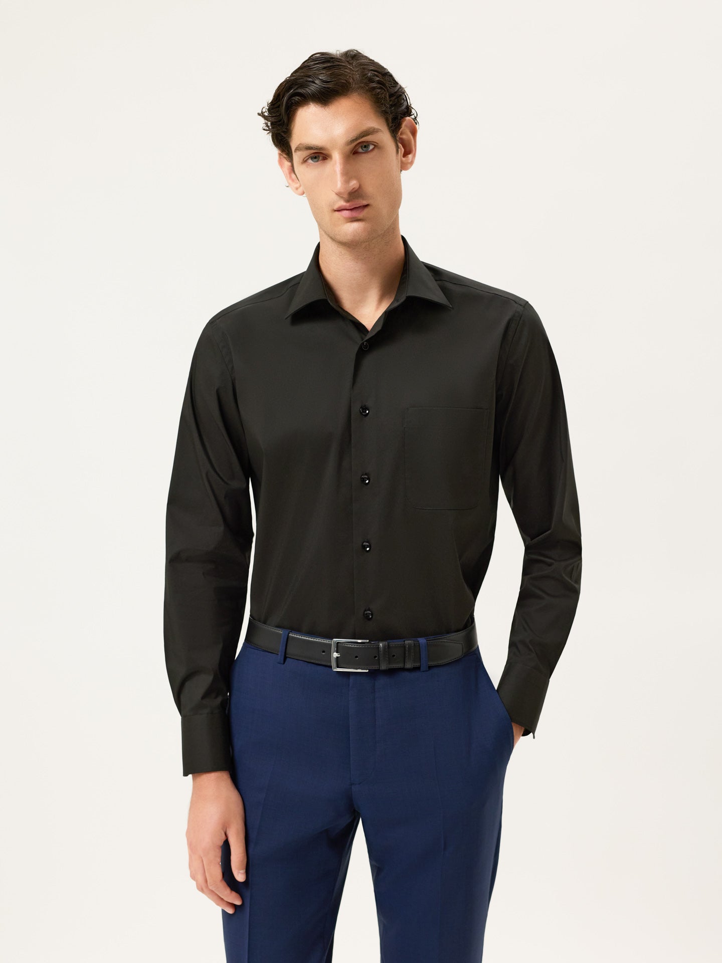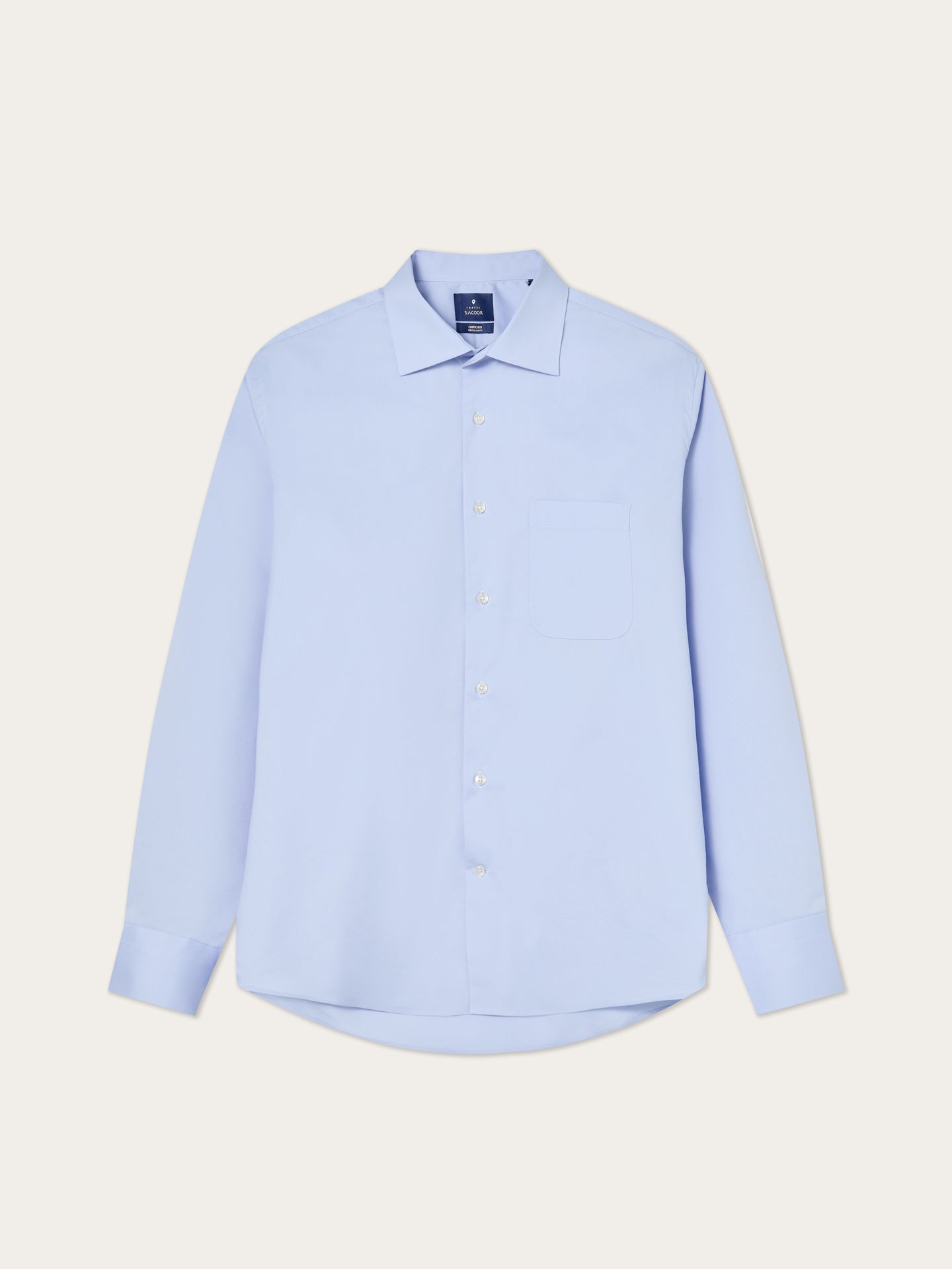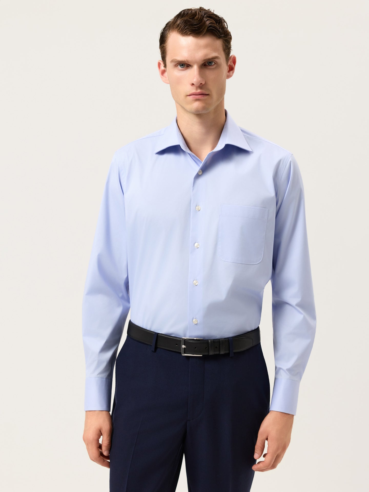 This long-sleeve shirt is cut in a regular fit from a travel-quality poplin blend, offering lightweight comfort and refined structure. It features an Oxford collar, single placket, chest pocket and standard cuffs. The shirt includes a discreet pleat on the sleeve, triangle inserts at the side seams in self-fabric, a horizontal last buttonhole in contrast thread, and off-white buttons. Detailed with removable collar stays, and reinforced construction for durability. This shirt is perfect for office wear and any occasion where a sharp look matters.