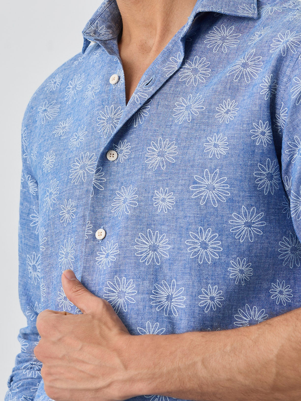 Slim Fit Shirt With Open Collar In Cotton-linen Blend With Print