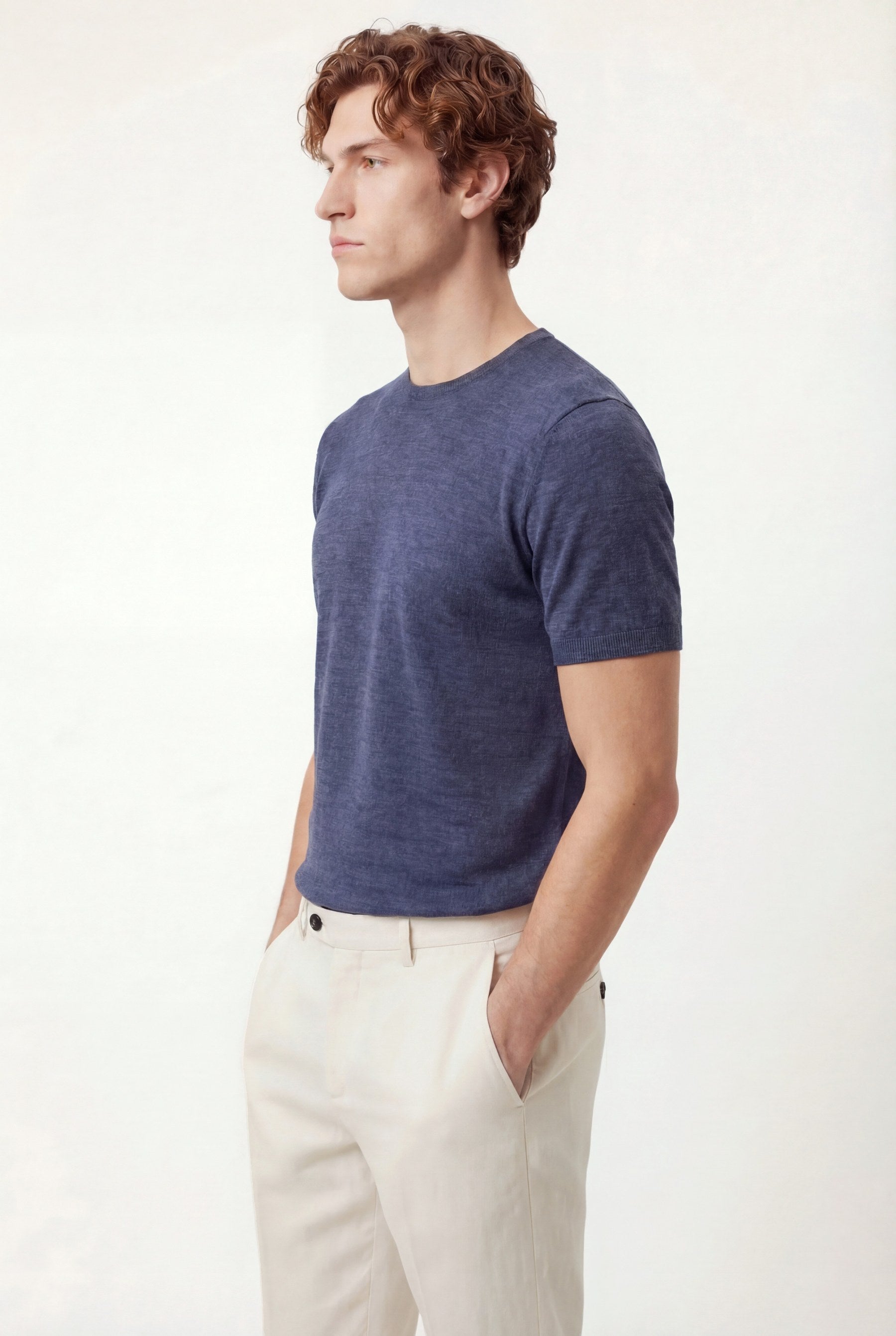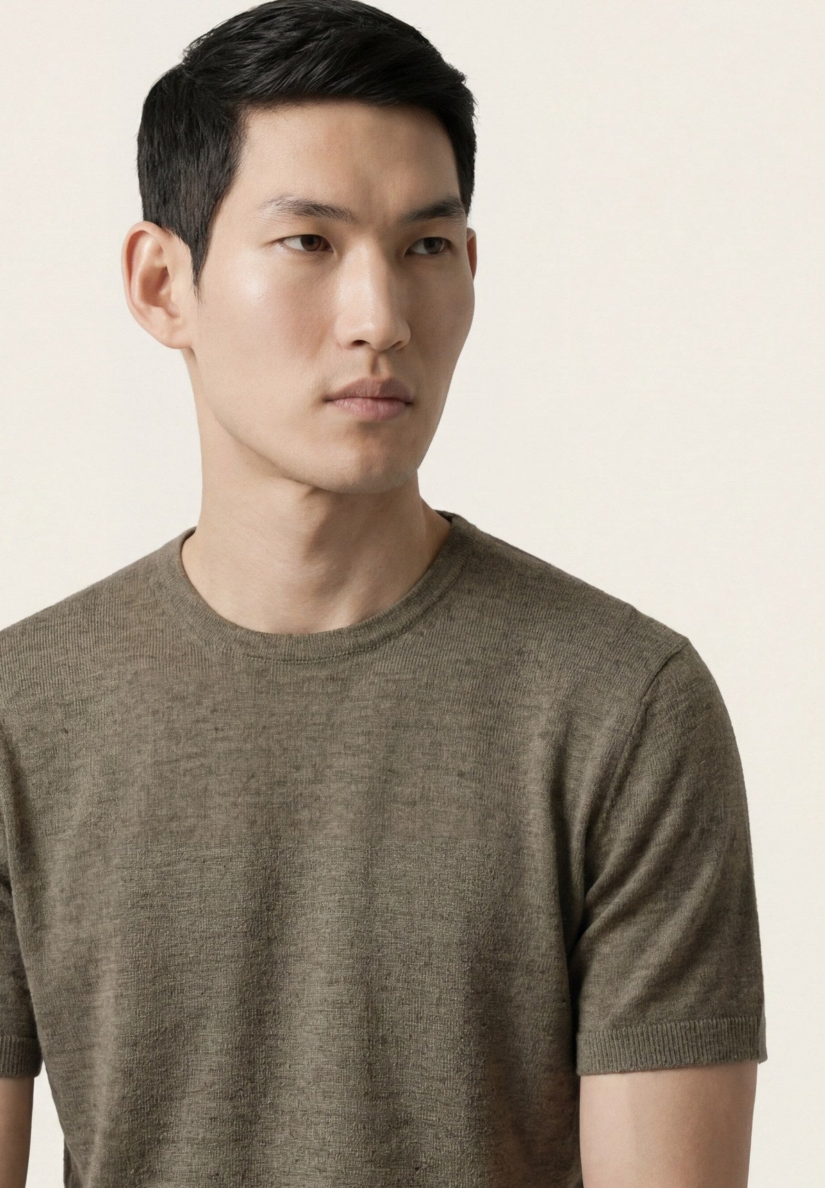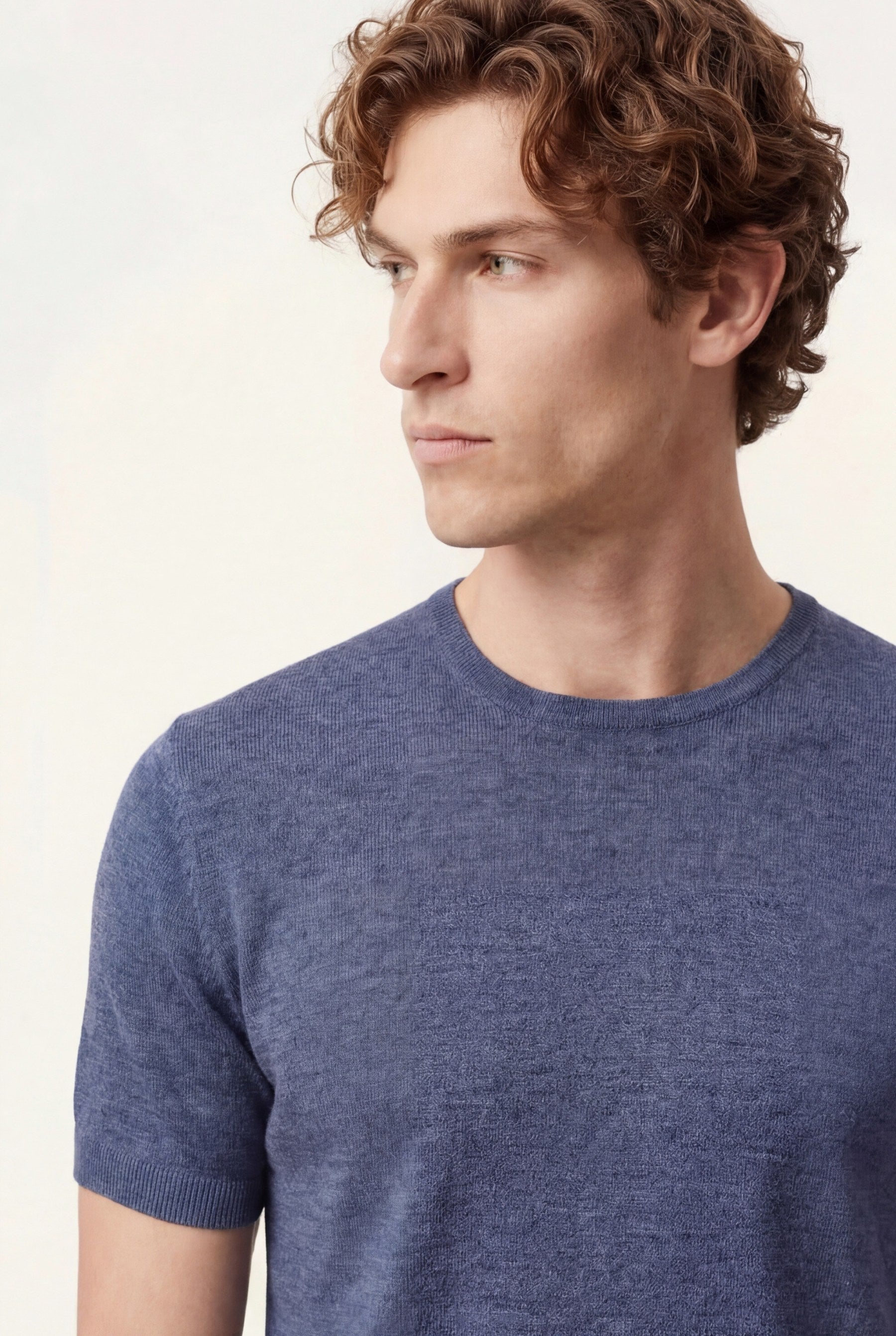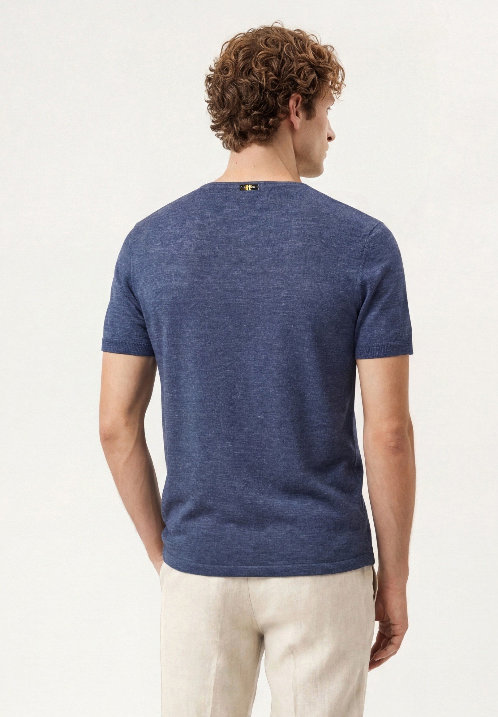 Short sleeve crew neck sweater made from 100% linen. Crafted in jersey knitting on body and sleeves, featuring tubular finishing at the neckline and bottom hem, and rib at sleeve hems. Finished with a Sacoor gun metal shine logo plate, laser engraved and stitched by hand at the back of the collar.
