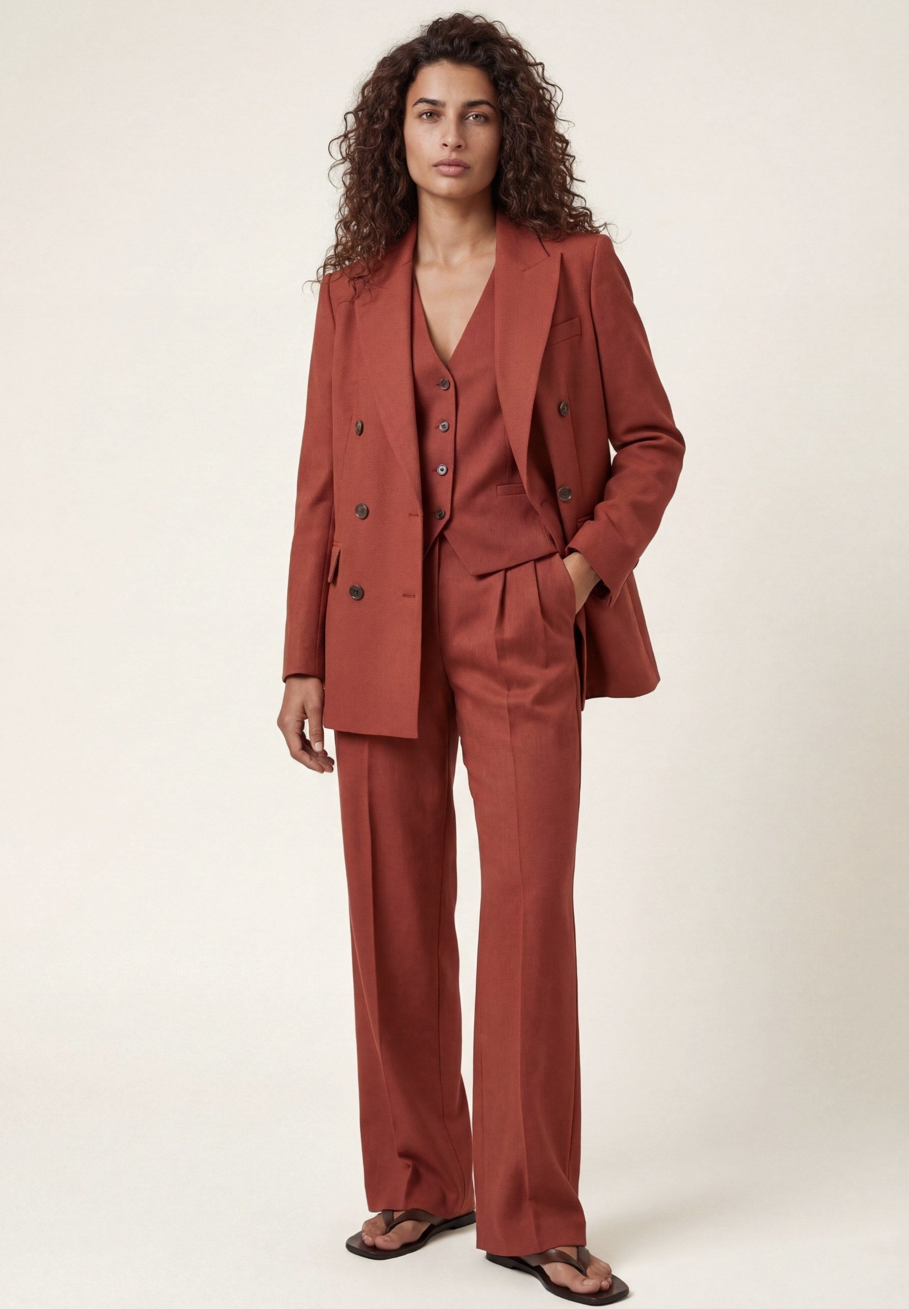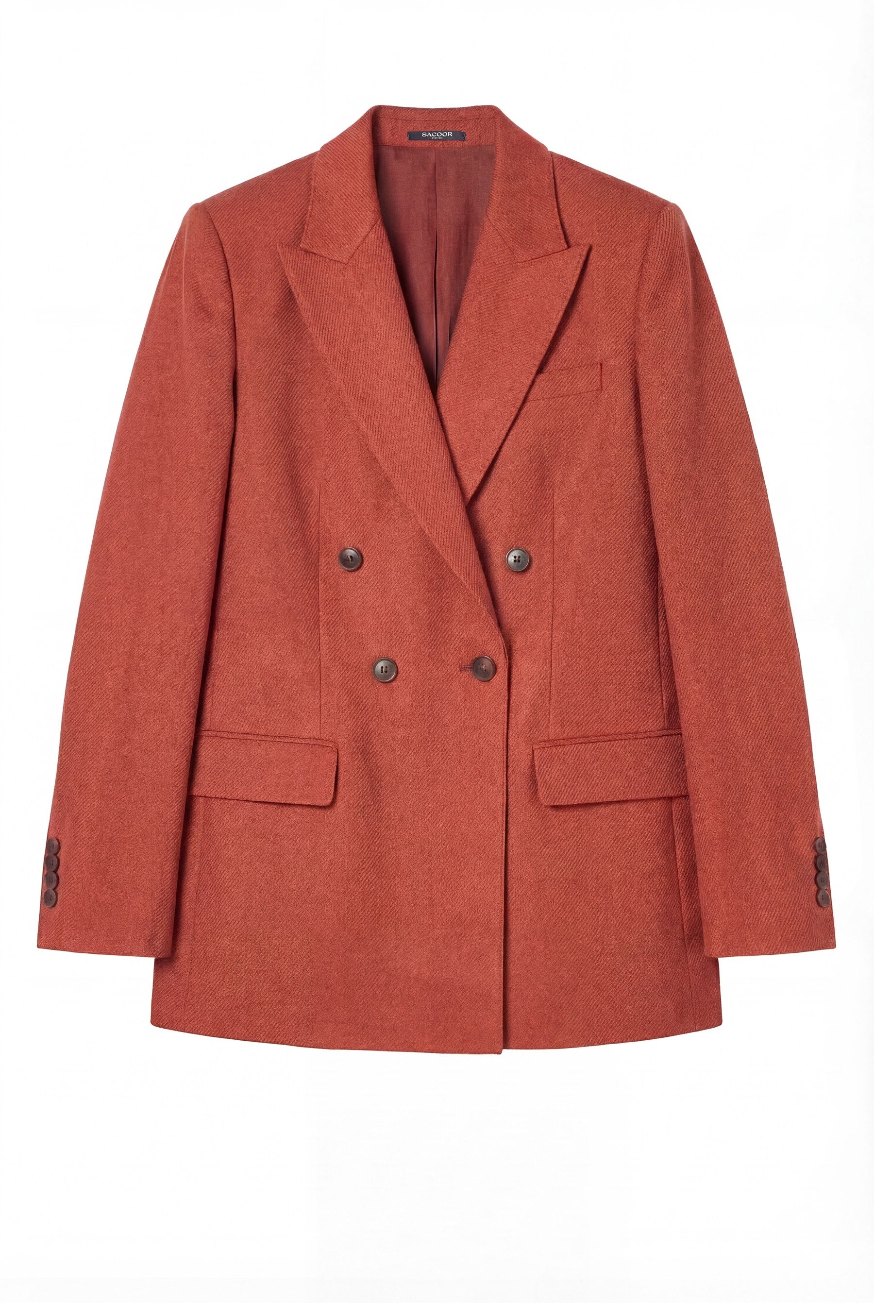 Regular fit blazer crafted from a cotton and linen blend with fused construction. Designed with a peak lapel and a completely straight silhouette with no waist shaping, featuring defined shoulders with thicker shoulder pads. Finished with a four-button front closure with engraved buttons, flap pockets with piping detail and back slit openings. Fully lined in poly-viscose twill, with clean internal finishing and an inside welt pocket in self-fabric. All metal parts are in matching silver finish.
