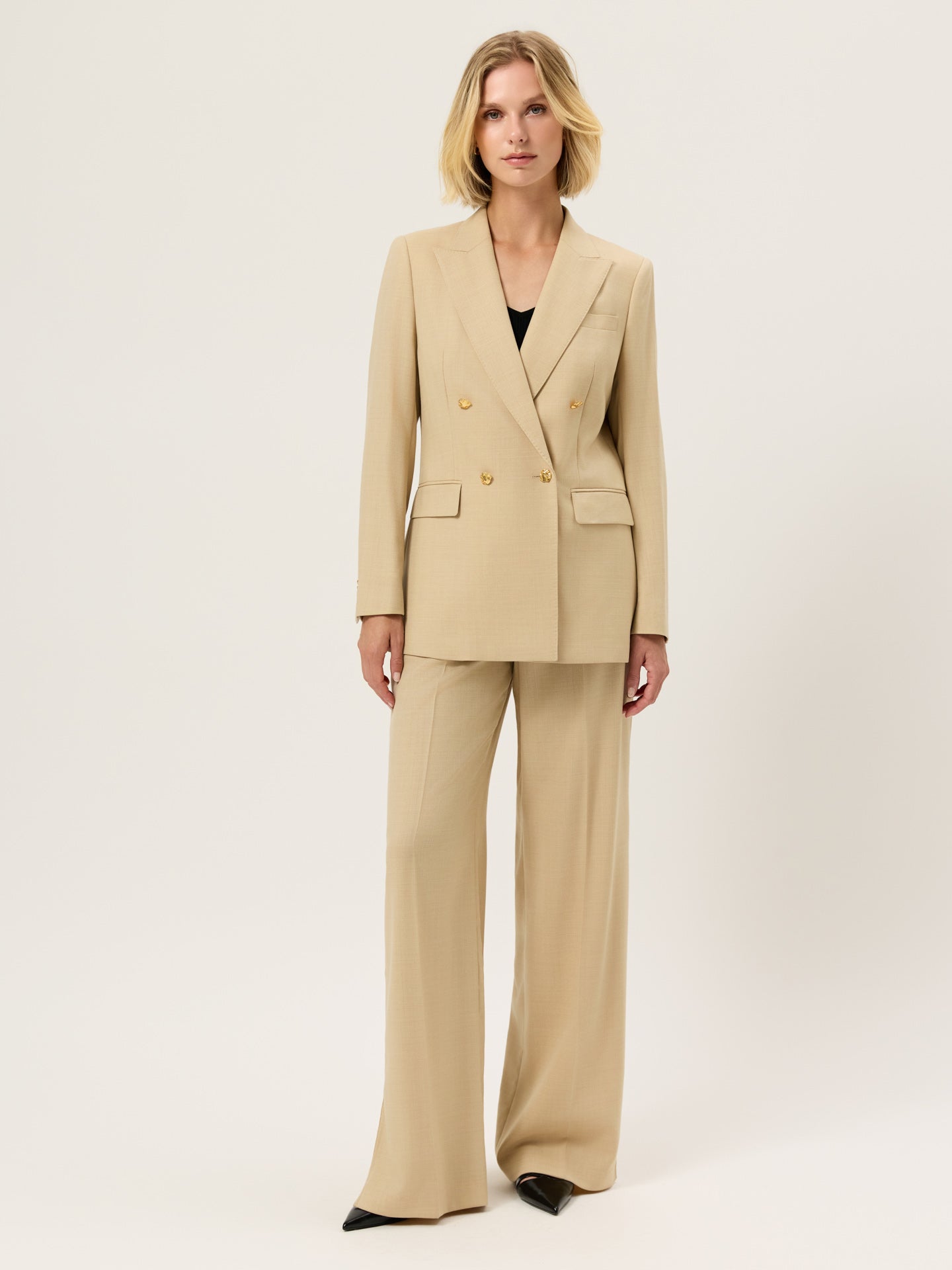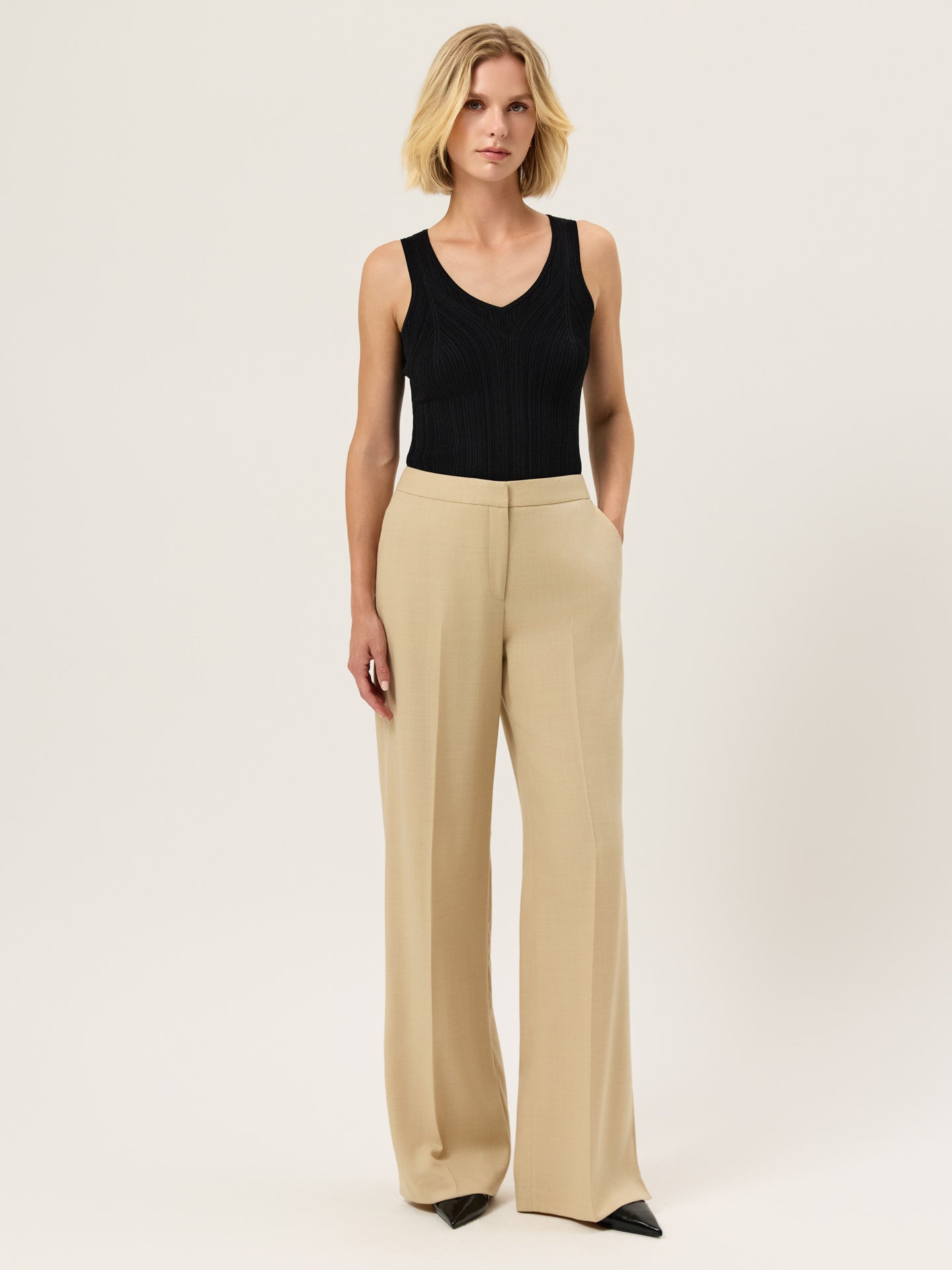 Creased high waist trousers expertly tailored from Wool blend Herringbone fabric with loose fit. Zip fly and hook and eye waistband fastening, side pockets, welt back pockets, and invisible hem.