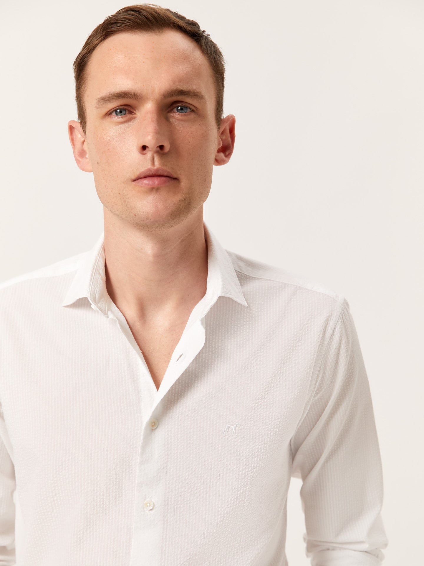 Slim Fit Seersucker Shirt in Cotton Elastane with Open Collar