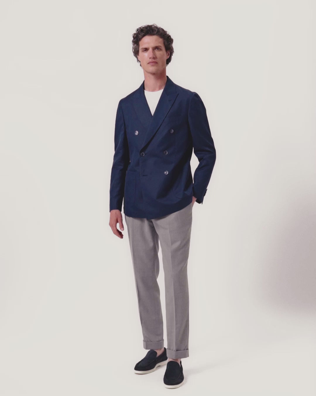Unstructured Dark Blue Linen-Cotton Blend Double-Breasted Blazer