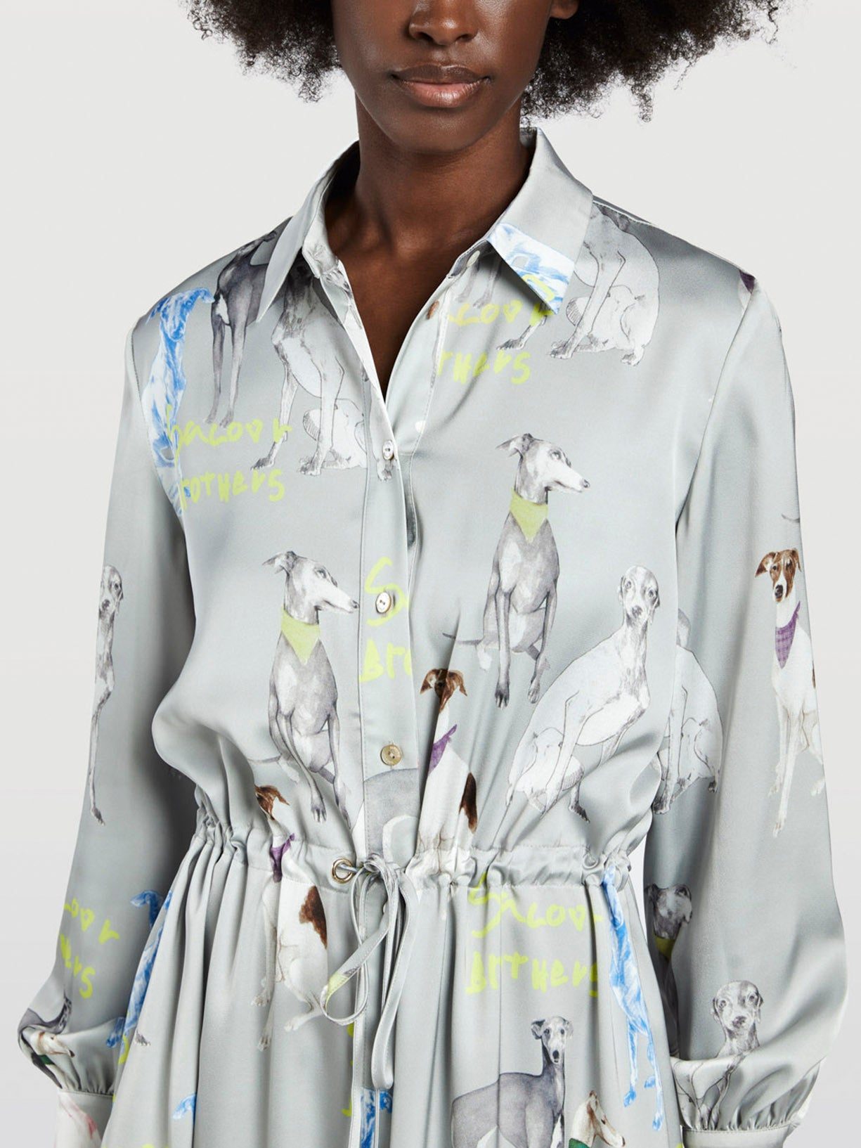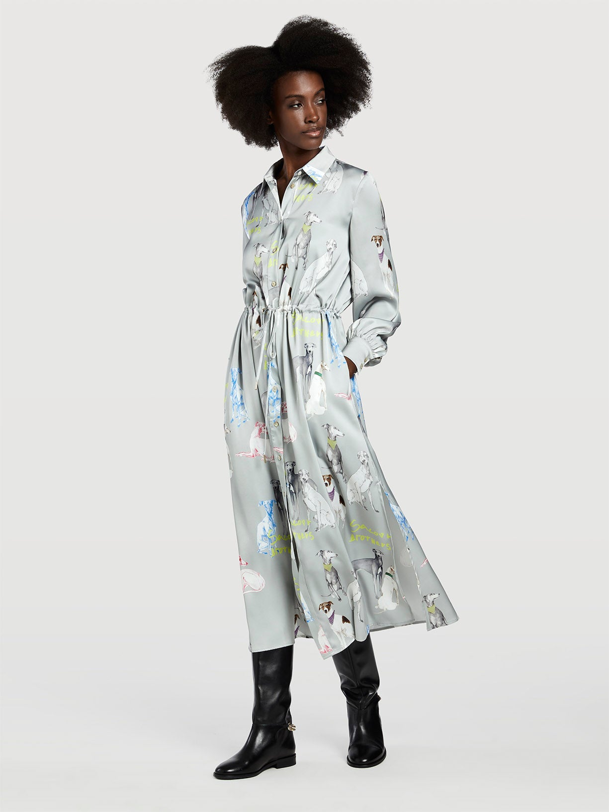 Long dress with special edition all-over print made by a renowned Portuguese fashion illustrator Antonio Soares. This collaboration brought alive a fresh representation of our greyhound logo, mixing the classic image with fun and colorful details for a more contemporary look. Features a small collar, front placket and cinched waist. Long sleeves with two button cuffs and side slits.