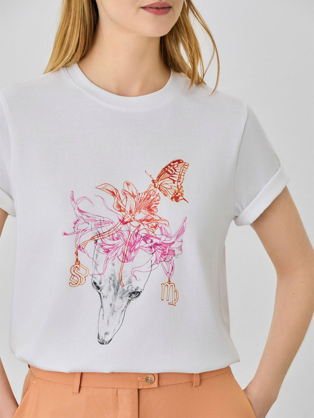 Regular fit Virgo t-shirt from our Special Edition Zodiac Capsule collection. Made in organic cotton with a Virgo Sign illustration by the renowned Portuguese Fashion Illustrator Antonio Soares. This special collaboration with Antonio Soares, brought to life a fresh representation of the zodiac signs trough our greyhound logo, mixing the classic image with fun and colorful details for a more contemporary look. Features a round neckline and short sleeves.