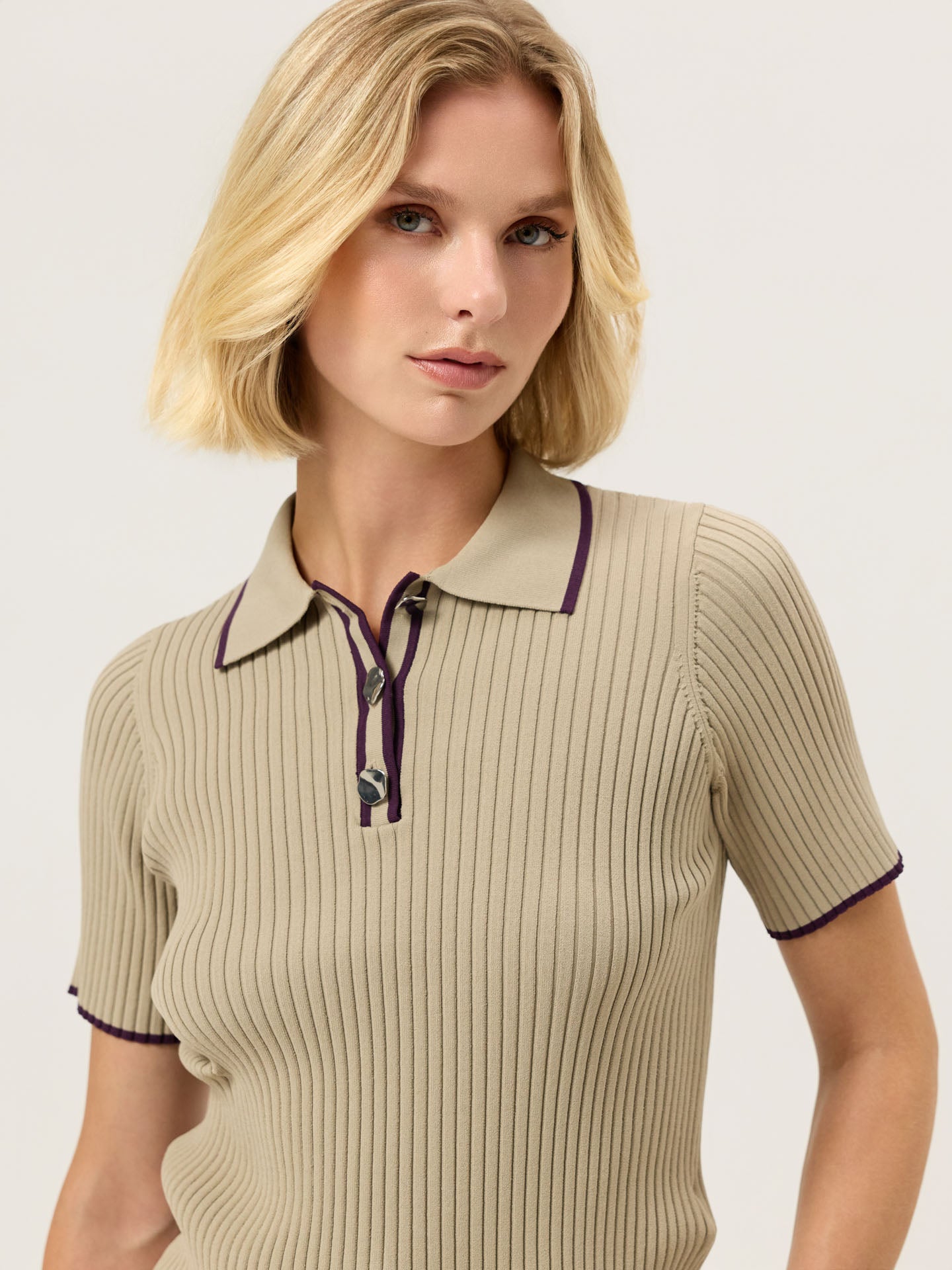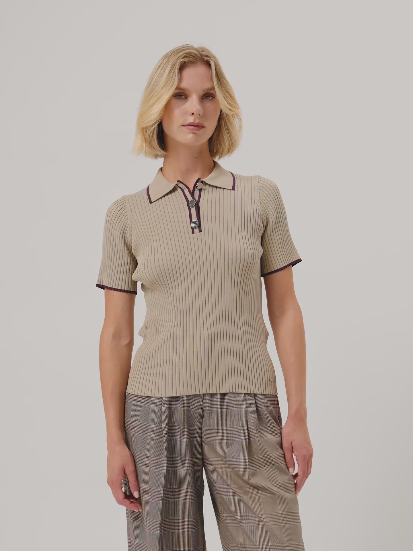 Short-sleeve polo sweater made from viscose blend, featuring an all-over rib knit design. It has a front placket with organic gold buttons, a ribbed knit collar, and constrast color stripe on the collar, placket and sleeves. Fully fashioned at the shoulder seams and armholes.