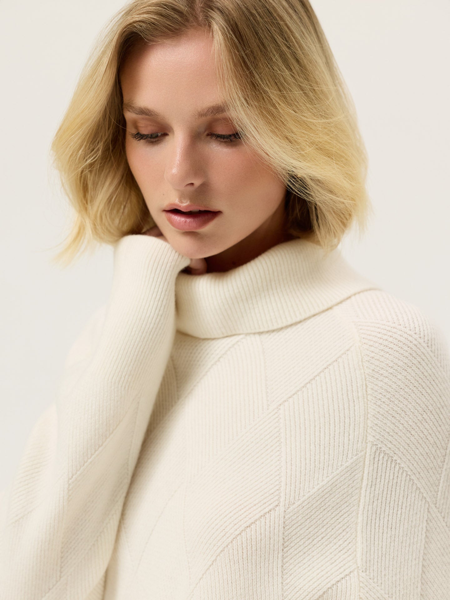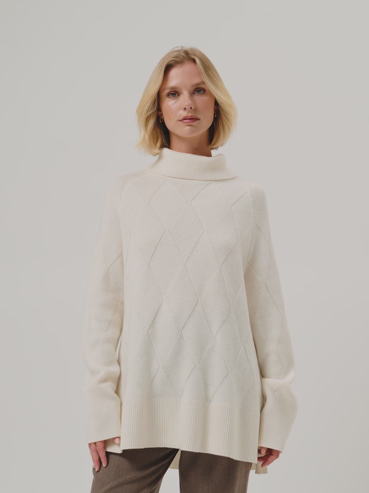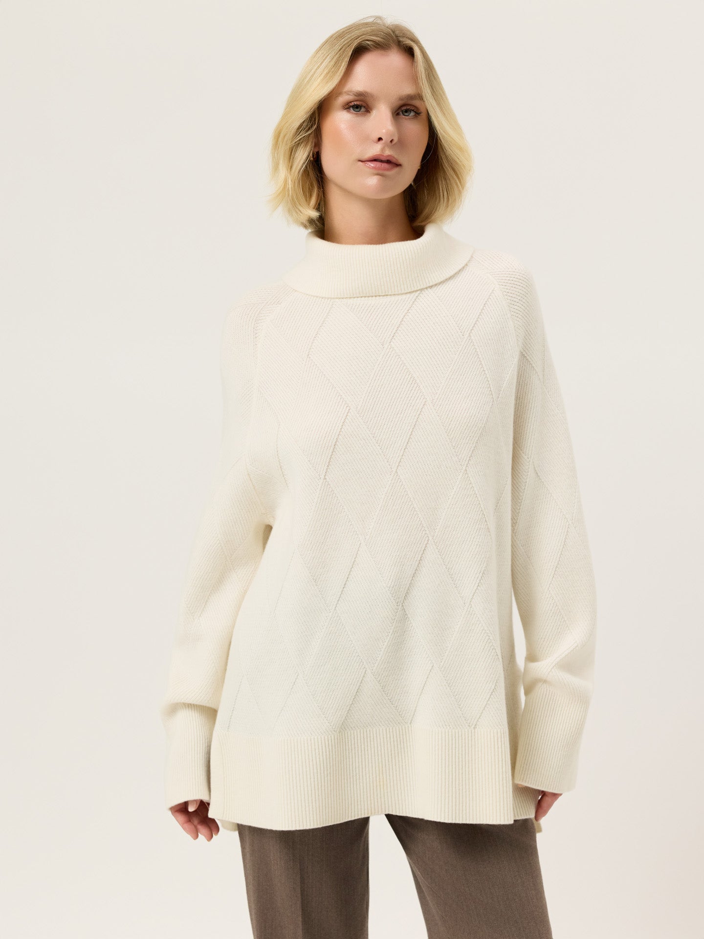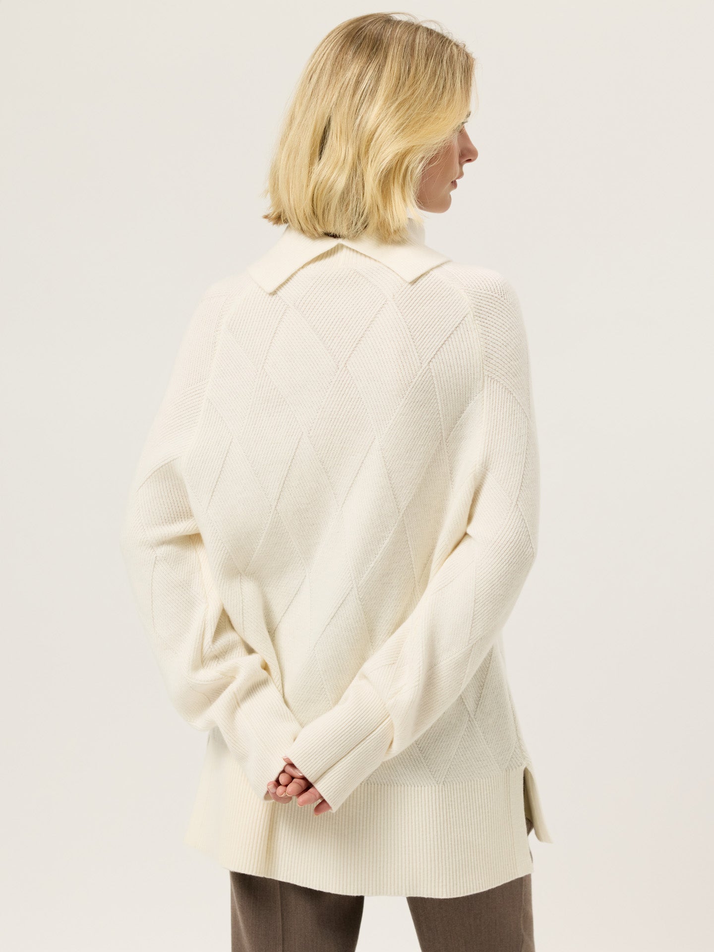 Long-sleeves roll neck sweater knitted from fine Lambswool. Designed with an all-over jacquarde texture, wide rib trims at the collar, cuffs, and hem. Fully fashioned at the shoulder seams and armholes for a clean, structured fit. Special details such as Sacoor Metal plate in Light Gold and slits on the sides a collar back. This piece is machine washable.